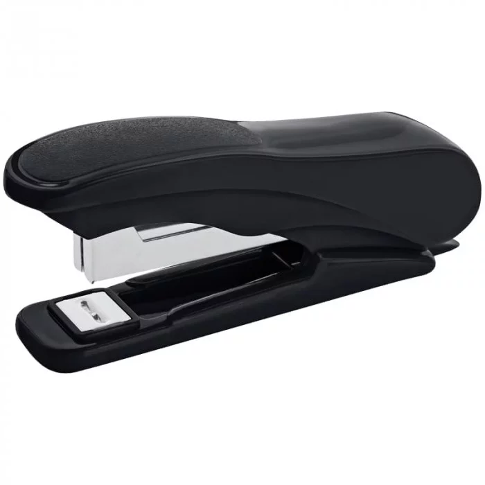 Удобный, пластиковый степлер для скоб №10, сшивает до 12 листов, вмещает 50 скоб, есть встроенный антистеплер. Цвет корпуса - черный.