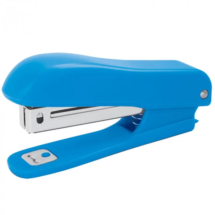Удобный, пластиковый степлер для скоб №10, сшивает до 12 листов, вмещает 50 скоб, есть встроенный антистеплер. Пластиковый корпус, металлический механизм с фиксатором, цвет корпуса - синий.