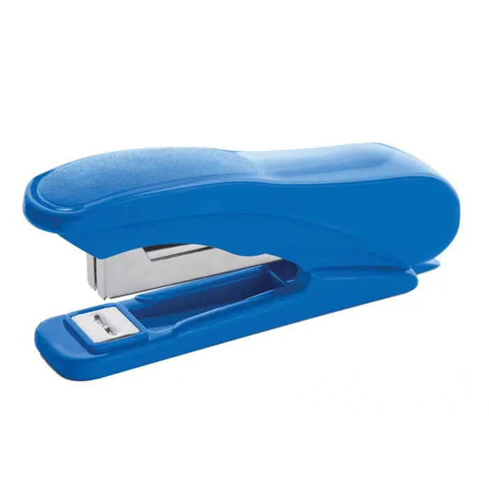 Удобный, пластиковый степлер для скоб №10, сшивает до 12 листов, вмещает 50 скоб, есть встроенный антистеплер. Цвет корпуса - синий.