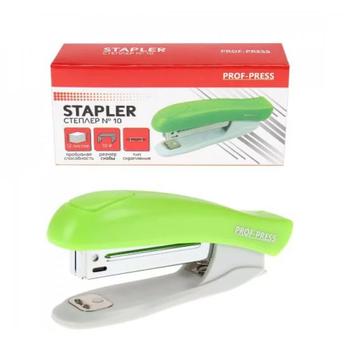 Cтеплер — незаменимый помощник в работе с большим объемом документов. Его рабочий механизм выполнен из металла, а корпус — из ударопрочного пластика. За счет компактного размера он не займет много места на рабочем столе. Размер скоб: №10. Упаковка: картонная коробка.