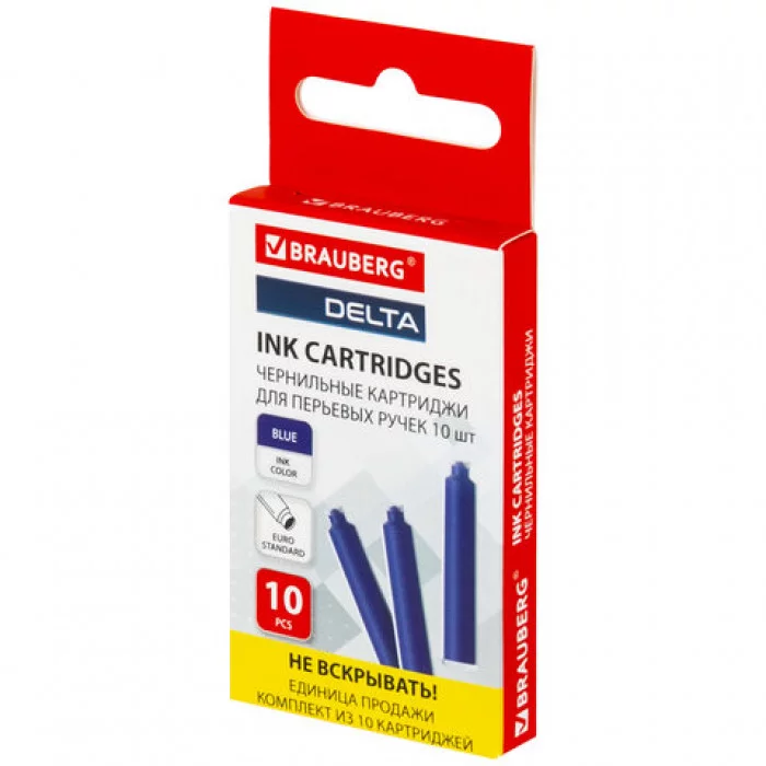 Картриджи чернильные BRAUBERG DELTA - универсальные для перьевых ручек. Комплект из 10 чернильных картриджей евростандарта. Картриджи универсальные, совместимы со многими перьевыми ручками. Цвет чернил - синий.Как убедиться, что картридж подойдет для ручки?1. Сравните размеры стандартного картриджа в ручке с картриджем BRAUBERG DELTA.Размеры BRAUBERG DELTA:- длина - 3,7 см;- диаметр коннектора (внутренняя часть картриджа, куда входит ниппель перьевой ручки) - 2,5 мм;- диаметр узкой (верхней) части картриджа - 4 мм;- диаметр широкой (нижней) части картриджа - 8 мм.2. При совпадении характеристик с картриджем в ручке можно сделать вывод, что эти картриджи взаимозаменяемы.3. Допустимое отклонение 1-2 мм (зависит от точности линейки). Тип товара: картридж. Цвет чернил: синий. Назначение: для перьевых ручек. Объем: 2 мл. Диаметр картриджа: 0.5 см. Длина картриджа: 3.7 см. Серия: DELTA. Количество в комплекте: 10 шт.. Материал флакона/картриджа: пластик. Упаковка: картонная коробка с европодвесом Бренд - BRAUBERG.
