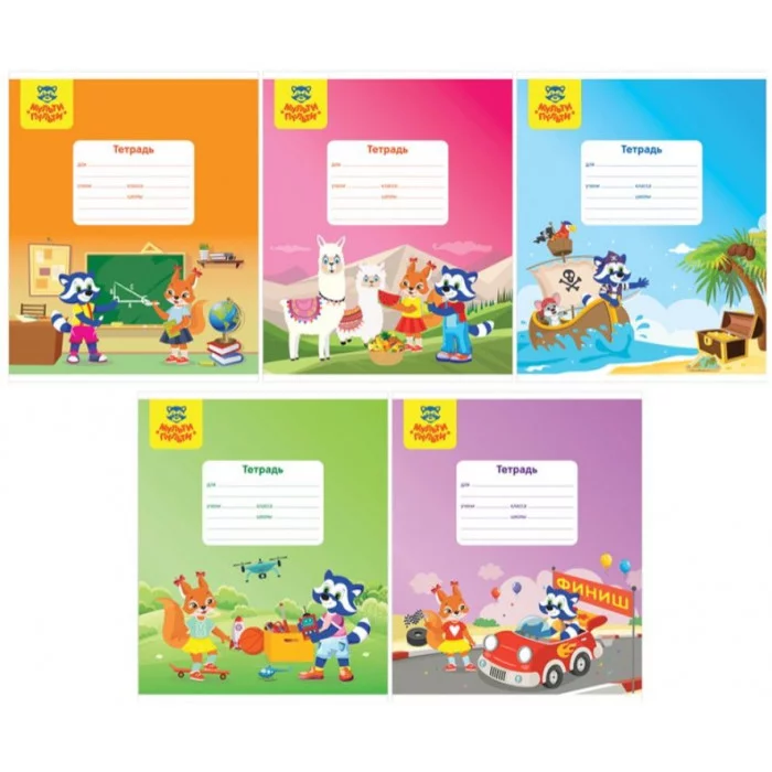 Тетрадь Мульти-Пульти имеет формат А5. Обложка выполнена из качественного импортного мелованного картона и покрыта ВД-лаком. Форзацы обложки содержат цветной справочно-обучающий материал - "Пиши цифры правильно" и "Состав числа". Внутренний блок – офсет 60-65 г/м², линовка - клетка с полями. Объем блока – 12л.