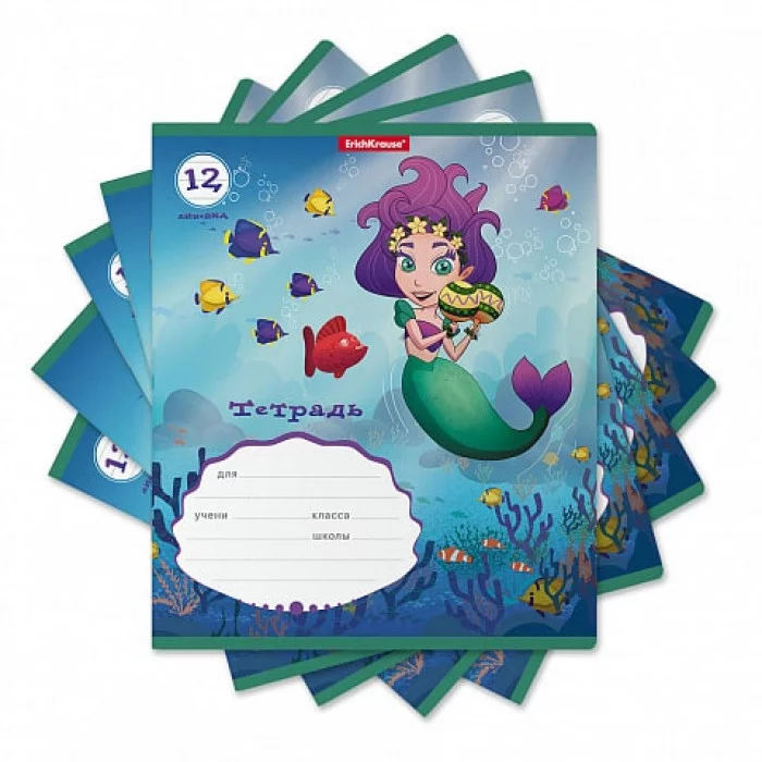 Тетрадь 12л., линия, ErichKrause, скрепка, блок офсет, мелованный картон "Русалочка", 5 дизайнов