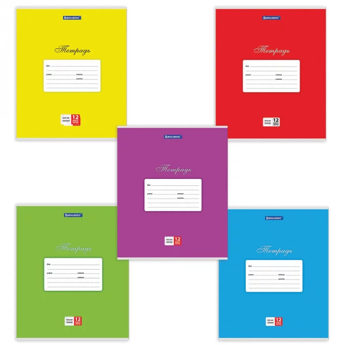 Тетрадь 12л. BRAUBERG КЛАССИКА, косая линия, обложка картон, АССОРТИ (5 видов), 103276