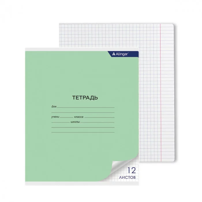 Тетрадь 12л., клетка, Alingar, скрепка, блок офсет, 100% белизна, мелованный картон (стандарт), "Зелёная"