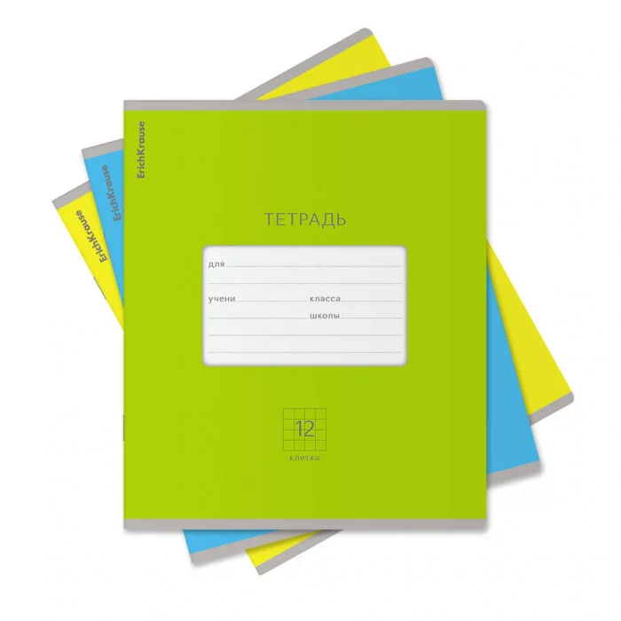 Тетрадь школьная ученическая формата А5+ (170х203 мм). Обложка из высококачественного мелованного картона плотностью 180 г/м2. В блоке 12 листов в клетку с полями. Бумага офсетная плотностью 60 г/м2. Цвет линовки - синий. Скругленные уголки обложки и блока. Тип скрепления - скоба. Соотношение цветов в коробке — 2 (зеленый) : 2 (голубой) : 1 (желтый). Товар поставляется в нескольких вариантах дизайна без возможности выбора.