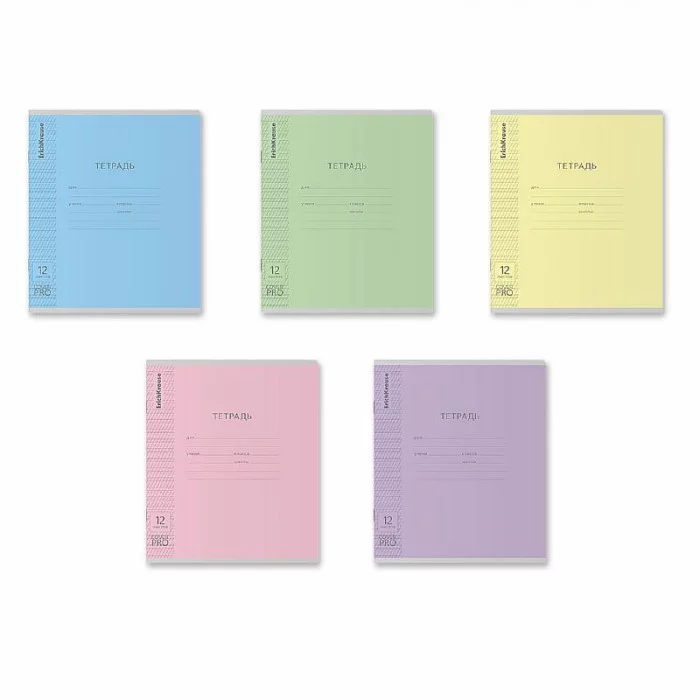 Тетрадь школьная ученическая формата А5+ (170x203 мм). Двойная обложка: внешняя выполнена из высококачественного износостойкого прозрачного пластика с фактурой «апельсиновая корка», внутренняя — из качественной мелованной бумаги. В блоке 12 листов в частую косую линейку. Бумага офсетная плотностью 60 г/м2. Цвет линовки — синий. Скругленные уголки обложки и блока. Тип скрепления — скоба. Тетради разных дизайнов упакованы в термоусадочную пленку по 10 штук.