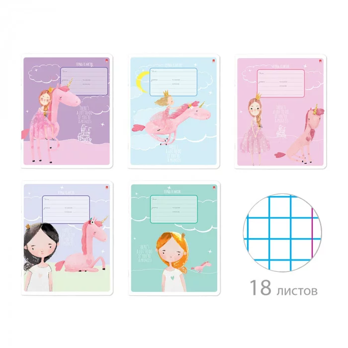 Школьная тетрадь объемом 18 листов в клетку. Это тетради дизайнерской серии "Young princess", иллюстрированные маленькими серьезными принцессами и единорогами. "There\'s a lot to do if you are a princess" сообщает надпись на лицевой стороне обложки. Есть 5 вариантов оформления. Такой набор тетрадей, несомненно, придется по вкусу юным самостоятельным школьницам. Выполнена в плотной обложке из мелованного картона, есть блок для подписи. Внутри бумажный блок из белой бумаги в клетку с красными полями закреплен скобами.
