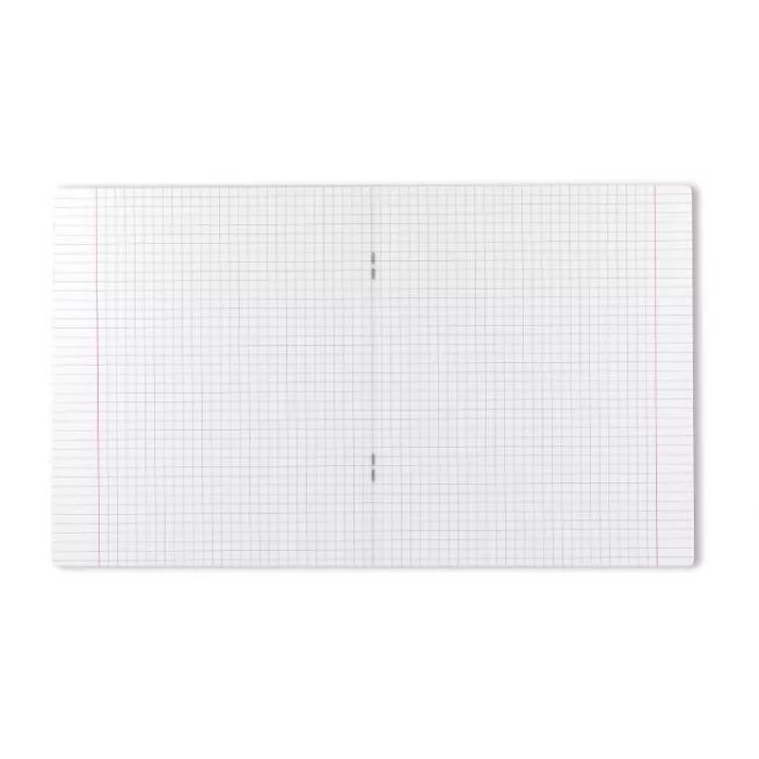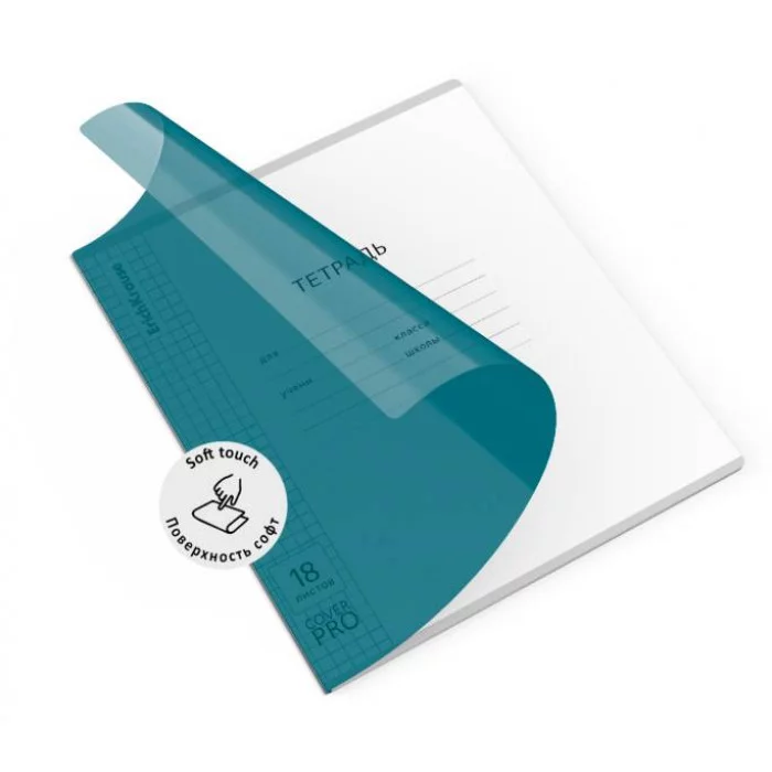 Тетрадь школьная ученическая формата А5+ (170x203 мм). Двойная обложка: внешняя выполнена из высококачественного износостойкого цветного пластика с фактурой «софт-тач», внутренняя — из офсетной бумаги. В блоке 18 листов в клетку. Бумага офсетная плотностью 60 г/м2. Цвет линовки — синий. Скругленные уголки обложки и блока. Тип скрепления — скоба.
