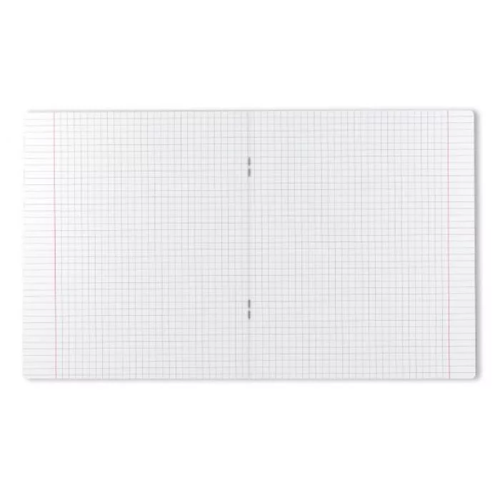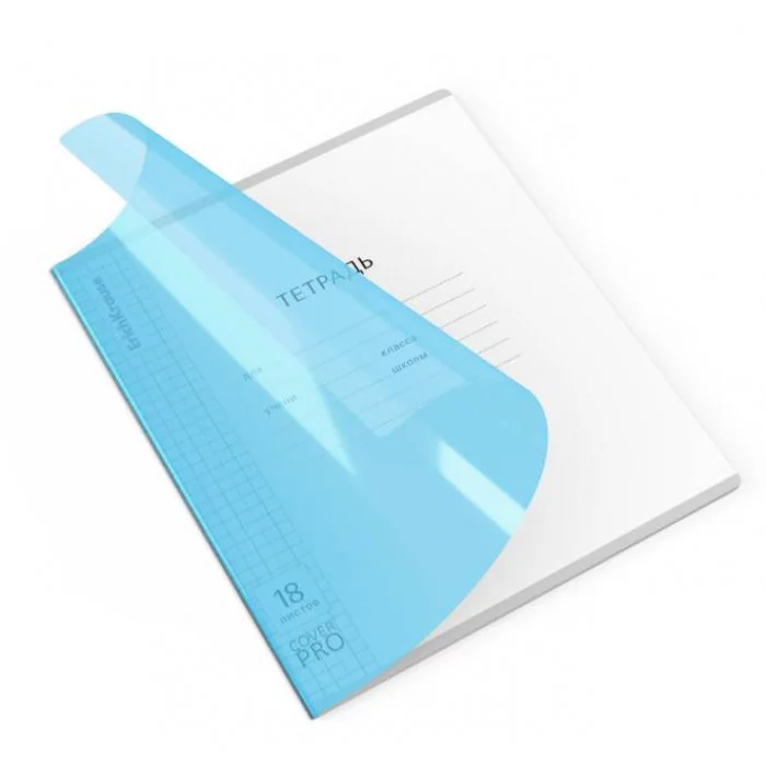 Тетрадь школьная ученическая формата А5+ (170x203 мм). Двойная обложка: внешняя выполнена из высококачественного износостойкого цветного пластика с фактурой «апельсиновая корка», внутренняя — из офсетной бумаги. В блоке 18 листов в клетку. Бумага офсетная плотностью 60 г/м2. Цвет линовки — синий. Скругленные уголки обложки и блока. Тип скрепления — скоба.