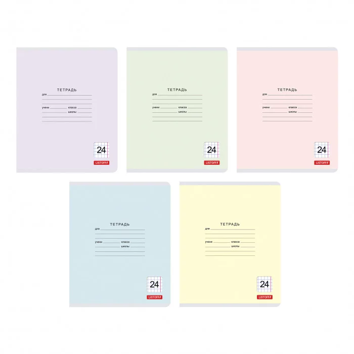 Тетради А5 24л. Скрепка. Клетка. Обл.: мел. картон. Бум. оф.60 г/м2. Скругл.уг. Поля. Уп./гофр.