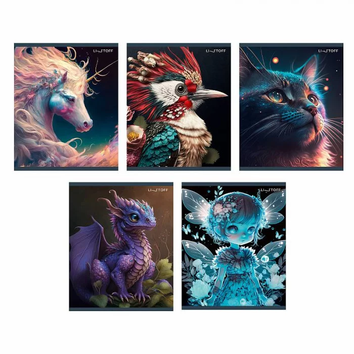 Тетрадь А5 48л. Скрепка. Клетка. Обложка: мелованный картон, глиттерный лак с блестками. Бумага: белый офсет 60г/м2. "Фантастические миры "
