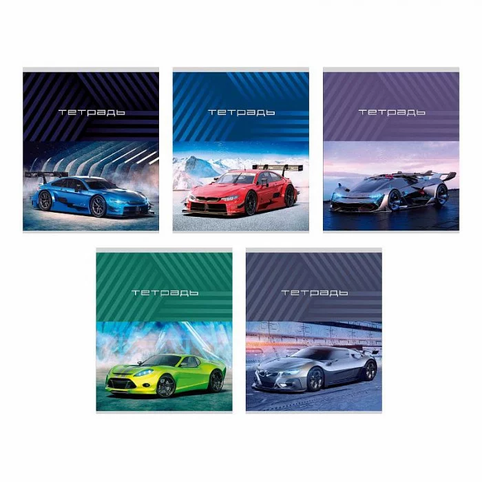 Тетрадь А5 48л. Скрепка. Клетка. Обл.: мел. картон. Бум. оф.60 г/м2. Поля. В уп. 5 видов. Уп./гофр.. "Победитель гонки"