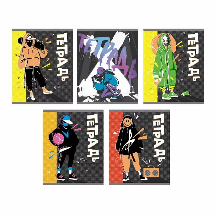Тетрадь А5 48л. Скрепка. Клетка. Обл.: мел. картон, выб. лак. пант.печ.скр. угл. Бум. оф.60 г/м2.Поля. В уп. 5 видов. Уп./гофр. по 10 шт. в терм. пл.. "Street life (Эксклюзив)"