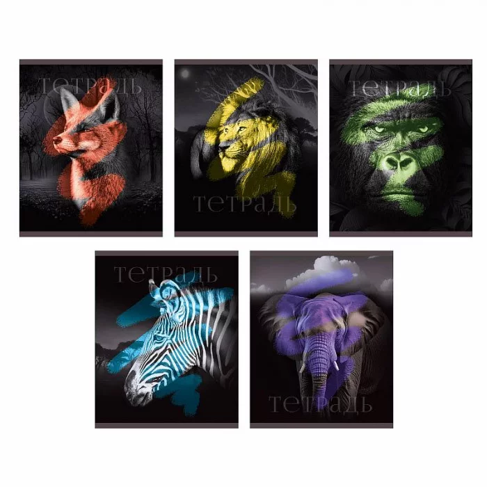 Тетрадь А5 48л. Скрепка. Клетка. Обложка: мелованный картон, печать по фольге, твин-лак. Бумага: белый офсет 60г/м2. "В мире диких зверей"