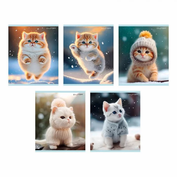 Тетрадь А5 48л. Скрепка. Клетка. Обл.: мел. картон, мат. ВД-лак, многоур. конгрев, выб.УФ-лак. Бум.оф.60г/м2. "Зимние котики "