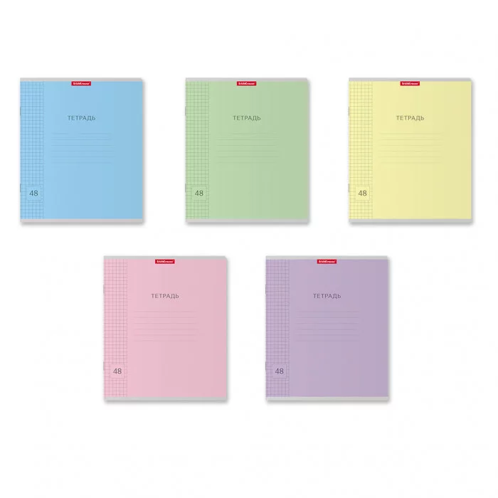 Тетрадь общая формата А5+ (170х203 мм). Обложка из высококачественного мелованного картона плотностью 190 г/м2. В блоке 48 листов в линейку с полями. Бумага офсетная плотностью 60 г/м2. Цвет линовки - синий. Скругленные уголки обложки и блока. Тип скрепления - скоба. Тетради разного цвета упакованы в термоусадочную пленку по 5 штук.