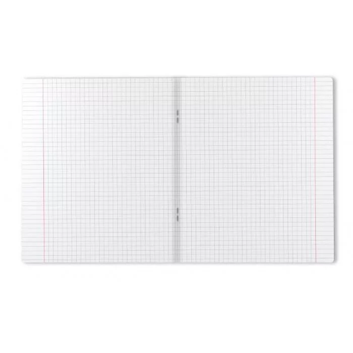 Тетрадь общая ученическая формата А5+ (170x203 мм). Двойная обложка: внешняя выполнена из высококачественного износостойкого цветного пластика с фактурой «песок», внутренняя — из офсетной бумаги. В блоке 48 листов в клетку. Бумага офсетная плотностью 60 г/м2. Цвет линовки — синий. Скругленные уголки обложки и блока. Тип скрепления — скоба.