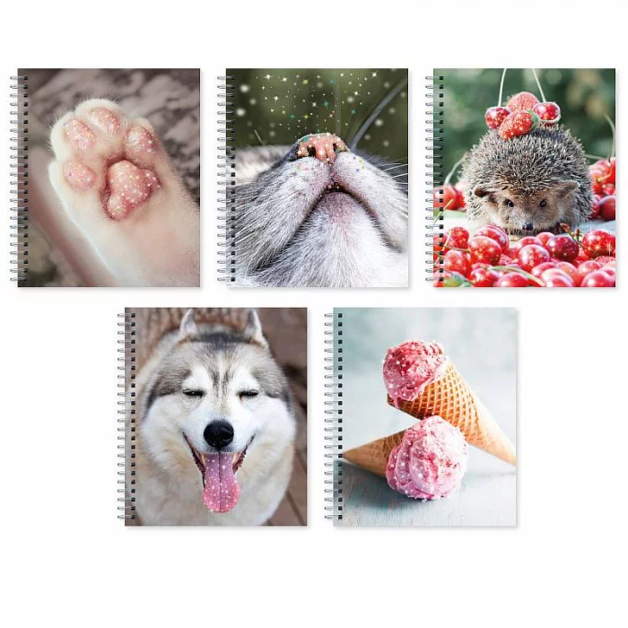 Тетрадь А5 48л. Гребень. Клетка. Обл.: мел. картон, выб. лак, блестки "Перламутр". Бум. оф.60 г/м2. В уп. 5 видов. Уп./гофр.по 8 шт. в терм. пл.. "Блестящие и милые "
