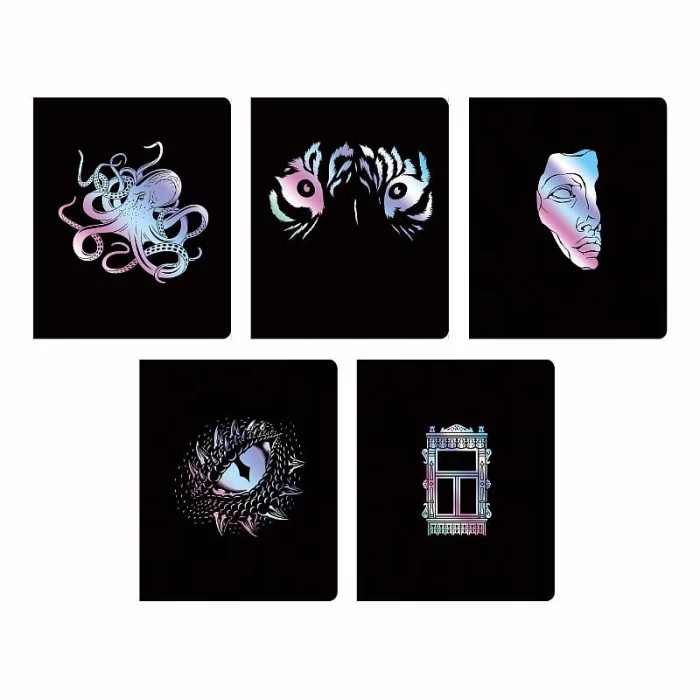 Тетрадь А5 96л. Скрепка. Клетка. Обл.:цветной диз. картон тиснение фольгой голография линза,скр. угл.Бум.оф.60г/м2.. "TOTAL BLACK. Микс"