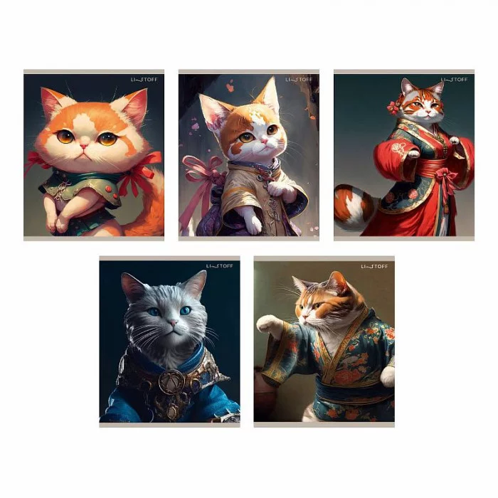Тетрадь А5 96л. Скрепка. Клетка. Обложка: мелованный картон, ламинация "soft touch". Бумага: белый офсет 60г/м2. "Восточные коты и кошки"