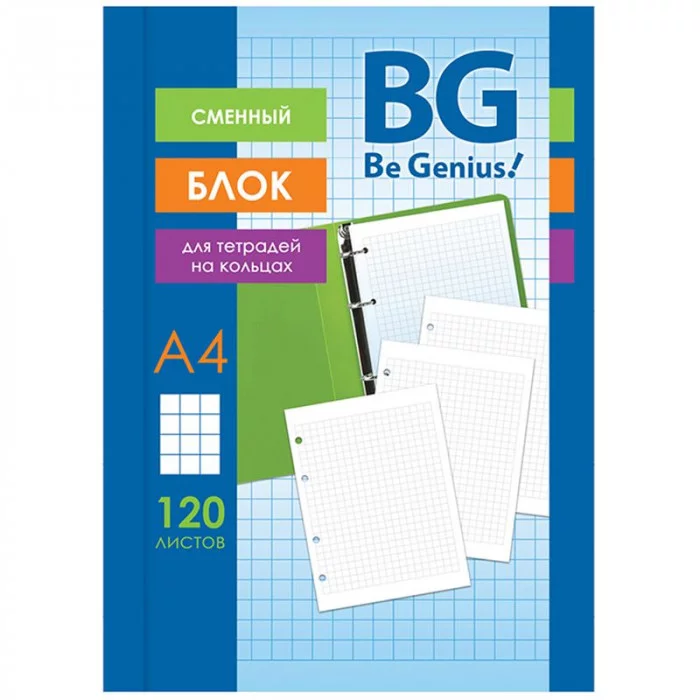 Сменный блок для тетрадей BG формата А4 (190*275 мм). Количество листов – 120 штук. Листы офсетной бумаги плотностью 60 г/м2 в клетку без полей упакованы в термоусадочную плёнку с полноцветной картонной этикеткой. Количество листов: 120; Линовка: клетка без полей; Формат: А4 (190*275 мм); Плотность блока: 60 г/кв.м.