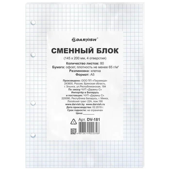 Сменный блок для тетрадей на кольцах А5 80л. белый DV-181