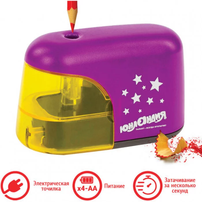 Яркая электрическая точилка со съемным контейнером для сбора мусора и прямым лезвием, работает от 4 батареек АА (в комплект не входят). Предназначена для затачивания деревянных и пластиковых карандашей диаметром 6-8 мм. Точилка с ярким фиолетовым корпусом, выполненным из ударопрочного пластика, и прочным прямым лезвием поможет ребенку быстро и качественно заточить любые деревянные и пластиковые карандаши диаметром 6-8 мм. Подходит как для чернографитных, так и для цветных карандашей. Имеет противоскользящее основание. Механизм приходит в движение при помощи электричества от 4 батареек АА (в комплект не входят) и оснащен предохранительным клапаном. Затачивание начинается автоматически после помещения карандаша внутрь точилки. Для правильной заточки необходимо удерживать карандаш от вращения. Уже через несколько секунд он идеально заточен и готов к использованию. Дизайн: детский. Серия: Stars. Питание: батарейки. Количество отверстий: 1. Тип лезвия: прямое. Материал корпуса: пластик. Наличие контейнера для стру
