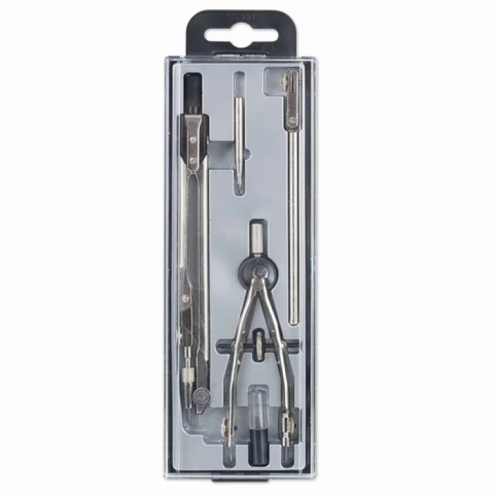 Набор чертежный, серия «Technica». В наборе 5 предметов: циркуль чертежный, длина 125 мм, нержавеющий металл; пенал с запасным грифелем, игольная вставка, кронциркуль и удлинитель. Упаковка: пластиковый пенал с европодвесом.