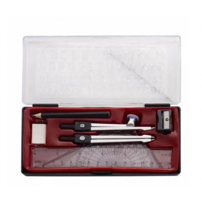 Готовальня Alingar, 11 предметов, металлический циркуль, кронциркуль,карандаш, набор линеек 4 шт, трафарет 2 ластик, точилка, пластиковый футляр AL711