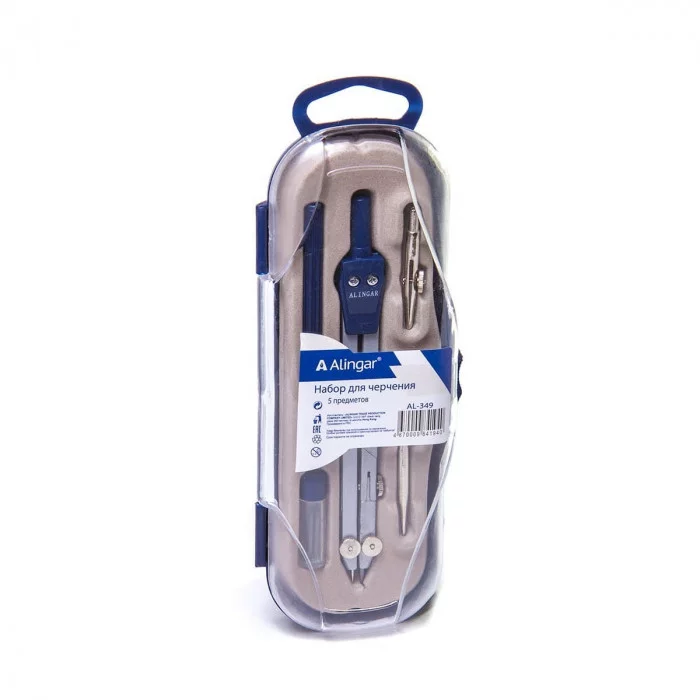 Готовальня Alingar, 5 предметов, металл. циркуль, удлинитель, точечная насадка, грифель, держ. для рейсф вставки, пласт. футляр, европодвес, синий AL349/1