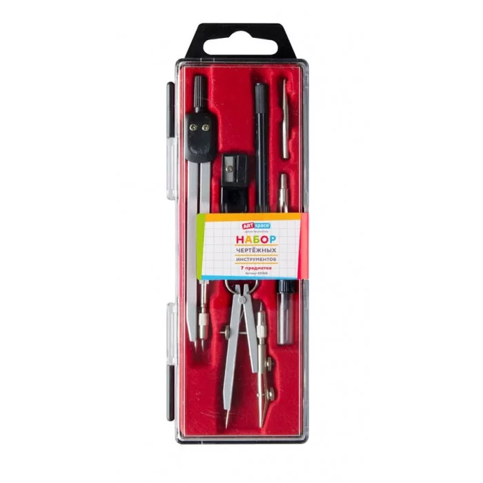 Набор в пластиковом пенале с европодвесом - 7 предметов: - циркуль - кронциркуль с рейсфедором - держатель рейсфедерной вставки - рейсфедерная вставка - запасной грифель - точечная насадка - точилка Товар предназначен для чертежно-графических работ.