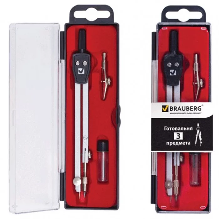 Готовальня BRAUBERG "Architect", 3предм:циркуль,сгиб.ножка,рейсф.вставка,грифель,пенал с подв,210331