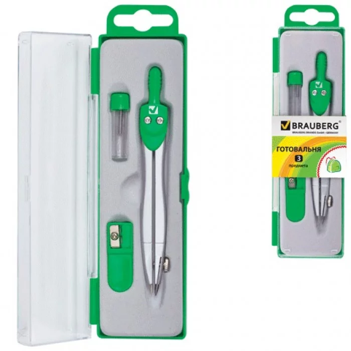 Готовальня BRAUBERG "Klasse", 3 предмета: циркуль 115 мм, грифель, точилка, пенал с подвесом, 210328