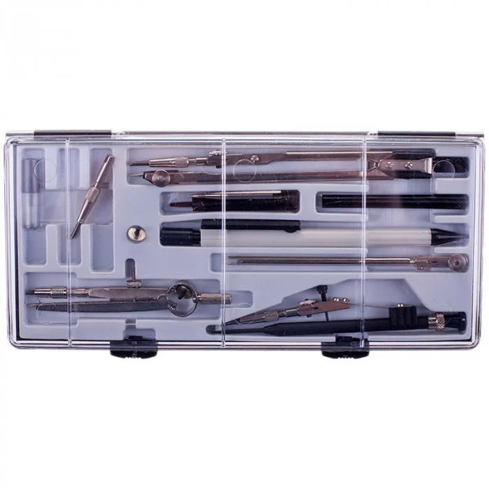 Используется для начертания окружностей. Длина ножки циркуля - 155 мм. В набор входят 12 предметов.