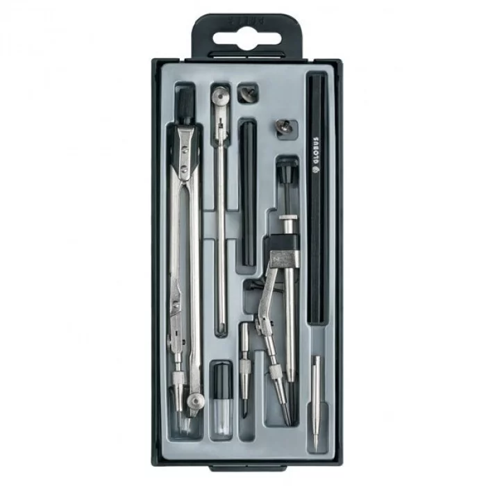 Используется для начертания окружностей. Длина ножки циркуля - 155 мм. В набор входят 10 предметов.