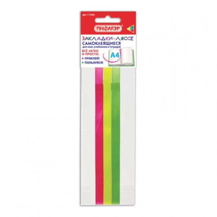 Закладки-ляссе "НЕОН" для книг А4 (длина 38 см) ПИФАГОР, клейкий край, 3 ленты, 111646