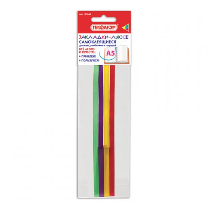 Закладки-ляссе "РАДУГА" для книг А5 (длина 28 см) ПИФАГОР, клейкий край, 4 ленты, 111648