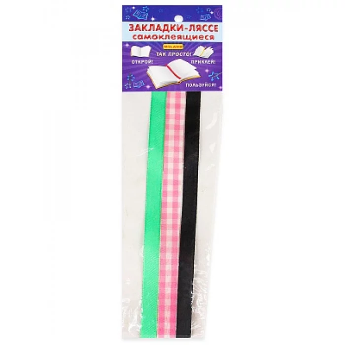Закладка-ляссе — одна из самых удобных закладок для учебников, книг и тетрадей. Она очень проста в использовании: липкую сторону нужно приклеить на заднюю часть обложки и плотно прижать. При необходимости, лишнюю длину можно отрезать.