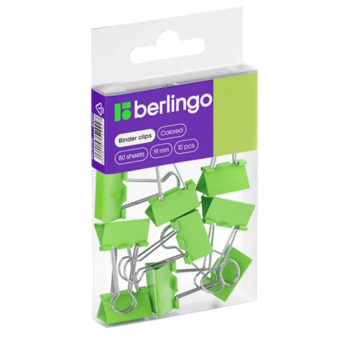 Зажимы для бумаг 19мм, Berlingo, 10шт., цветные, ПВХ упак., европодвес, зеленые 301707