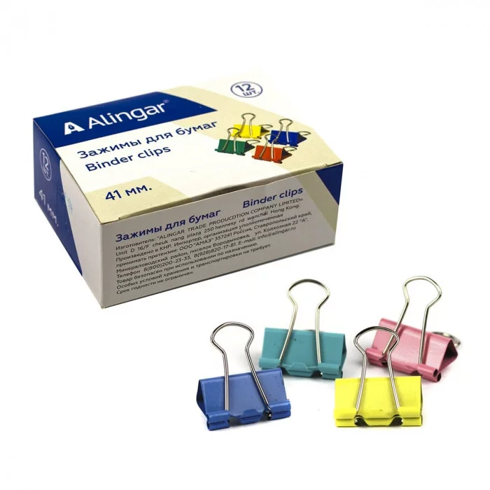 Зажимы для бумаг Alingar шириной 41 мм выполнены из прочного металла и имеют цветное покрытие. Они предназначены для скрепления большого объёма листов, что делает их незаменимыми в повседневной работе с документами. Цветное покрытие придаёт зажимам яркий и привлекательный вид, что особенно важно для организации и систематизации документов.