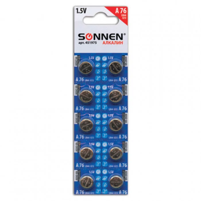 Батарейка 1шт SONNEN Alkaline, A76 (G13, LR44) , алкалиновая 451975