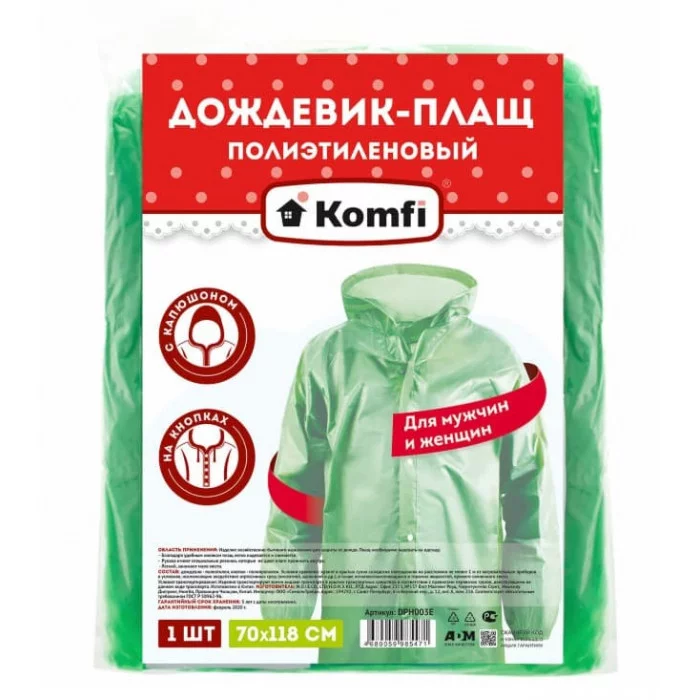 Дождевик-плащ зеленый на кнопках полиэтиленовый, универсальный размер, 118х70 см, KOMFI, DPH003E