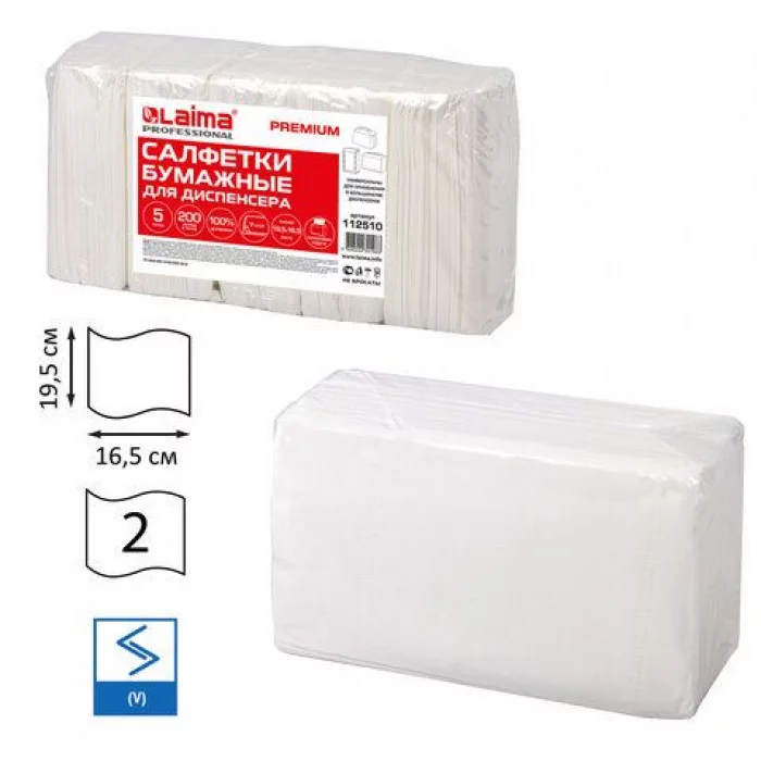Салфетки бумажные для диспенсера, LAIMA (Система N4) PREMIUM, 2-слойные, КОМПЛЕКТ 5 пачек по 200 шт., 19, 5х16, 5 см, белые, 112510