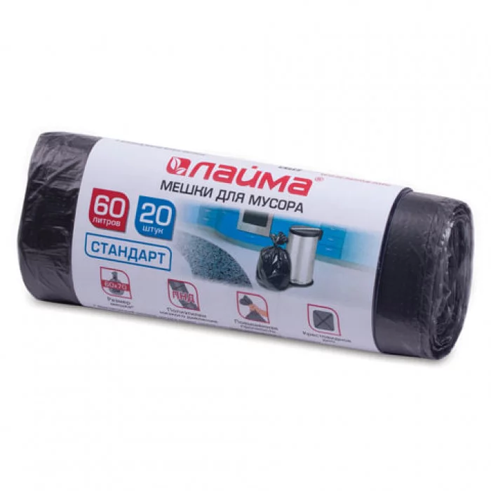 Мешки для мусора 60 л, черные, в рулоне 20 шт., ПНД, 10 мкм, 60х70 см (±5%), стандарт, ЛАЙМА, 601381