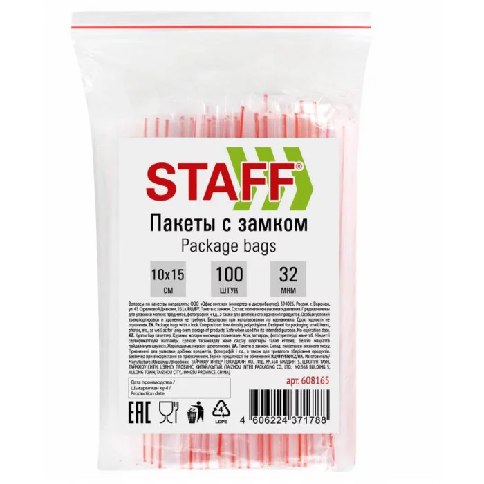 Быстрозакрывающиеся пакеты STAFF предназначены для упаковки различной продукции, в том числе пищевой. Отлично подходят для упаковки мелких предметов, фотографий, медицинских препаратов и т.д. Обладают высокой эластичностью, сохраняют свежесть продуктов, предохраняют содержимое от посторонних запахов. Застежка позволяет быстро и герметично запечатать пакет с содержимым. Прозрачные пакеты с замком "зиплок" плотностью 32 мкм в комплекте 100 штук. Изготовлены из ПВД (полиэтилена высокого давления). Размер - 10х15 см. Размер: 100х150 мм. Толщина материала: 32 мкм. Тип: пакет с замком. Количество в упаковке: 100 шт.. Материал: полиэтилен высокого давления (ПВД). Цвет: прозрачный