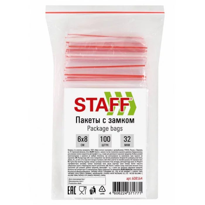Пакеты с замком ZIP-LOCK "зиплок", комплект 100 шт., 60х80 мм, ПВД, толщина 32 мкм, STAFF, 608164