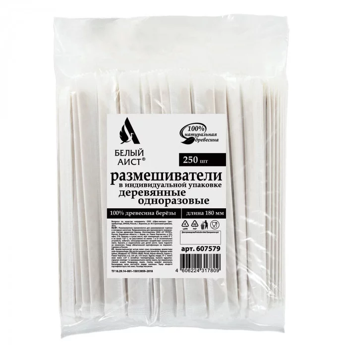 Размешиватель одноразовый деревянный в индивидуальной упаковке 180 мм, 1шт., БЕЛЫЙ АИСТ 607579