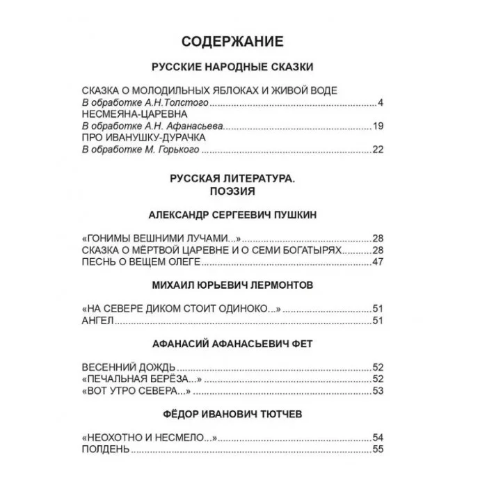Хрестоматия состоит из четырёх разделов и включает в себя произведения русской народной литературы, прозу и поэзию русских классиков, а также сказки зарубежных авторов. Все произведения, составившие хрестоматию, входят в программы по школьному и внеклассному чтению.