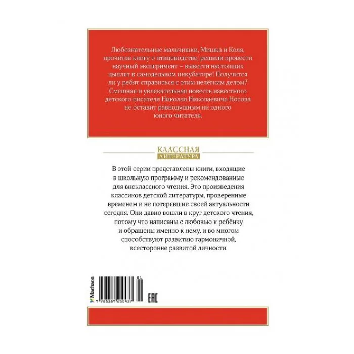 Любознательные мальчишки, Мишка и Коля, прочитав книгу о птицеводстве, решили провести научный эксперимент – вывести настоящих цыплят в самодельном инкубаторе! Получится ли у ребят справиться с этим нелёгким делом? Смешная и увлекательная повесть известного детского писателя Николая Николаевича Носова не оставит равнодушным ни одного юного читателя